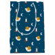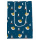 Vår Cute Winter Dove & Lantern Gift Bag-design har en vit fredsduva som flyger i himlar med en halvljus måne, ljusa lanternor och dubbla stjärnor på en svart bakgrund.