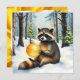 A sweet Christmas card that you can personalize with a sweet watercolor raccoon holding a gold ornament sitting in a snowy forest.