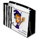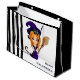 En stor presentväska med en söt häxa med stor lila häxhatt. Hennes svarta katt vilar på hennes huvud. Hon har långa orangar och bär en bomme. Cute tecknad illustration perfekt för halloween.