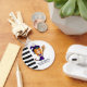 En nyckelkedja med en söt häxa med stor lila häxhatt. Hennes svarta katt vilar på hennes huvud. Hon har långa orangar och bär en bomme. Cute tecknad illustration perfekt för halloween. Svart och vitt rand på lämnat sida. Personlig namn och texten "bra häxa" som är skriven nedan.