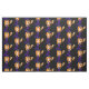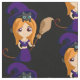 Fabric med en söt häxa med stor lila häxhatt. Hennes svarta katt vilar på hennes huvud. Hon har långa orangar och bär en bomme. Cute tecknad illustration perfekt för halloween.