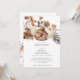 En charmerande falltema för babyduschinbjudan med sovfox i ett pumpplåster, med lövning. Anpassa för en pojke eller flicka. Mjuka pasteller i grädde och bruna.