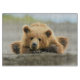 Fotot från Getty Bilder har en ung brunbjörn vid kusten som ligger på en strand som väntar på att mamma ska fånga fisk i Alaska.