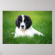 Det här söta Getty Bilder-fotot har en Landseer-valp som är ljugande på gräsmatta.