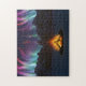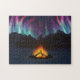 I en snötäckt dal på en frostig natt mitt i vintern flammar en brasa upp för att spegla norrskenet som fyller himlen ovanför de avlägsna bergen.