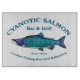 En blåtonad Sockeye Salmon med texten "Cyanotic Salmon Pub & Grill Kenai, Alaska" och "Combat Fishing Rest and Relaxation". Laxfisket är mycket populärt, alltför populärt i Alaska. Föreställ er hundra sportfiskare, ungefär skuldra till skuldra, som i båda banker i en ström försöker undvika att korsa linjer med alla andra i hopp om att landa en stor lax. Det är stridsfiske. Efter en dag tar du lite R&R på den mytiska cyanotiska laxen i Kenai. Fiskeberättelser där..Ja.