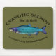 En blåtonad Sockeye Salmon med texten "Cyanotic Salmon Pub & Grill Kenai, Alaska" och "Combat Fishing Rest and Relaxation". Laxfisket är mycket populärt, alltför populärt i Alaska. Föreställ er hundra sportfiskare, ungefär skuldra till skuldra, som i båda banker i en ström försöker undvika att korsa linjer med alla andra i hopp om att landa en stor lax. Det är stridsfiske. Efter en dag tar du lite R&R på den mytiska cyanotiska laxen i Kenai. Fiskeberättelser där..Ja.
