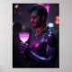 A mysterious figure holding a glowing chalice amidst purple neon mist, representing digital hedonism.