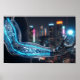 En fantastisk, fotorealistisk bild av ett mycket detaljerat cybernetiskt arm med en elegant, metallisk avsluta. Utformningen har en ljusblå energikanal, en intrikad mekanisk växel och en hand med en glödande datamängd chip, som alla ställs mot en suddig, nyupplyst cyberpunk stad. Biet är perfekten för fläkt av sci-fi, teknik och futuristiska.