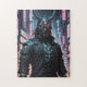 Den här intensiva bilden visar en hotfull demon samurai, med en futuristiska, en mörk och en mask med rött ögon och horn. I en nybelyst stadsmiljö inspirerad av cyberpunkestetik står tecknet mitt i många belysta tecken och symboler, vilket antyder ett starkt, högteknologiskt citysslande.