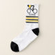Cyklist som kör sin cykel visningar en minimalistisk ikon av en svart silhuett med gult överst och ditt namn med en gult och svart stripe gräns.