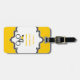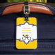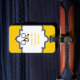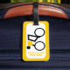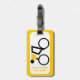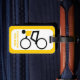 Cyklist som kör sin anpassningsbar-bagagemärke med en minimalistisk ikon av en svart silhuett med gult överst och texten på vit bakgrund med gult gräns. .