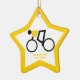 Cyklist som kör sitt cykliska keramiska prydnadsämne i stjärnform visningar en minimalistisk ikon av en svart cyklande silhuett med gult överst och texten på vit bakgrund med gult gräns.