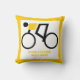 Cyklist som kör sin cykel anpassningsbar dekorativ kudde visar en minimalistisk ikon av en svart silhuett med gult överst och texten på vit bakgrund med gult gräns.