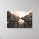 Kanvastryck av vissa cyklar som är låsta pub vid en bro över Prinsengracht-kanalen och som är invändigt invändigt vid de traditionella kanalhusen vid solnedgången i Amsterdams stadskärna i Nederländerna. Underbar dekoration på väggen!