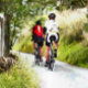 Två cyklister i tävlan som njuter av Wales land-körfält. Vattenfärg.