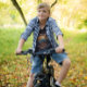 Cykling Life, återmålning i orange och blått av en cyklist som kör genom bergen och skogen med sol i bakgrunden