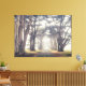 Liten väg inlagd med hög cypress träd i tjockt dimma på en tidigt-vår-dag vid Point Reyes National Seashore i Kalifornien.