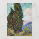 Ett vykort för bra med målningen Cypresses (1890) av den nederländska konstnären Vincent van Gogh (1853-1890). Ett postimponerande landskap med en stor cypress träd i förgrunden och ett snurrande färglöst himmel med ett krympande måne.