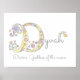 Söt D initial-/monogramkonst namn poster perfekt för ett flickors sovrum eller spelrum i nyans av grått, vitt, gult, rosa och lila. Personligen med ditt barns egen namn, från D:t till namn, och med som innebörd för en verklig personlig till ditt barns sovrum eller förskola, är detta exempel för namn D Dyvah Divine, måne guddess gudinna. Cute poster utskrift som passar perfekt för en nyfödd bebis-, ristening- eller babyduschpresent. © Unik inledande brev D-hjärtan och blommor teckning beskrivning och grafisk konsdesign av Sarah Trett. www.sarahtrett.com för www.mylittleeden.com