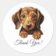 Denna charmerande Dachshund-Tack-dekal är en perfekt för hundälskare som uppskattar denna rass unika och roligt karaktär. Lägg till en lekfull, personlig beröring till ett tackkort eller en present.
