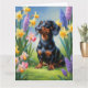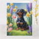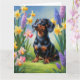 En glad hund sitter fridfullt på frodig grön gräs, omgiven av färgrika vårblommor under en mjuk blå himmel. Denna digitala oljemålning fångar ett lugnt ögonblick med uttrycksfulla penseldrag, varma färger och en känsla av mild glädje.