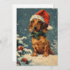 helgdag med ett charmerande julkort med en vacker Dachshund som donerar en festlig julhatt. Den lekande valpens glatta uttryck och hattens visuella beröring för med sig värme och beröm till kortet. Perfekt för spridning av sjömil och säsong hälsning, detta kort fångar helgdagarnas anda med sin närliggande hund charm. Skicka önskemål för en svan-högsäsong med det här hjärtslitande och vackra julkortet.