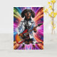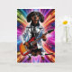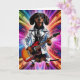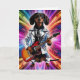En Dachshund i en glansig silver-apparat spelar gitarr med en psykodelisk bakgrund.