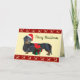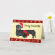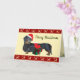 Söt julscen. Svart och brun dachshund utklädd som tomte. En hög med presenter och en julkaramell. Söt randig stickad kant framtill och på insidan. Detta vackra julkort är tomt på insidan så att du kan anpassa det.