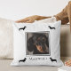 Lägg till ditt favoritfoto från Dachshund i dekorativ kudde, personlig med namn och med svart Dachshund-silhouettes i varje hörn, som visas på vit bakgrund. Bakgrunden till färg kan ändras till kostym som du vill använda för dekor eller färg.