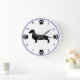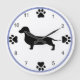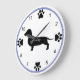 En hund älskare-klocka med silhuetten från en dachshund, där tass avtryck markerar kvartstimmarna.