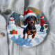 En lekfull dachshund springer genom det snöiga vintersceneriet och bär en festlig röd julhatt. Denna charmiga design framhäver rasens långa kropp, korta ben och livliga personlighet samtidigt som den fångar värmen och glädjen under julen. Ett förtjusande vinterögonblick fullt av festlig glädje.