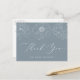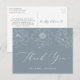 Tack för elegantens blommigt, vykort med en vit blomma som har dammig blå bakgrund och som har en vit bakgrund gräns och en vit blomma. "Tack" visas i ett vitt, modernt skript med ditt namn som visas nedan. Baksidan av vykortet innehåller ditt returadress- och anpassningsbar-meddelande i svart text. Tack för blommigten du vykort är perfekt till använda för bröllop, möhippor, babyduschar, födelsedagar och mycket annat!