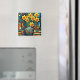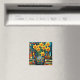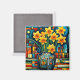 A.I. skapat tolkning av en pulserande bukett av gult daffodils framträder mot en bakgrund av surreala geometriska former och fet färg. De hårt mönstrade vas hyser blommorna.