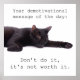 Ditt demografiska budskap för dagen: Gör det inte, det är inte värt det. Text med en svart katt som sover på vit bakgrund. Lustigt roligt. Allvarligt.
