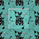 En söt mönster av svarta katter, atomstjärnor och abstrakt som inspireras av halvsekelmodeller i vackra toner av teal, blått, svart och grått.