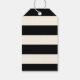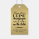 Elegant bröllopspresentetikett med ett roligt och fräckt "Dags att dricka Champagne och dansa på bordet"-citat i en stilisert vintage-typografidesign med en anpassad monogram med brudens och brudgummens namn och bröllopsdatum. Ett modernt svart-vit-randigt mönster pryder baksidan av kortet. Den guld färgade bakgrunden kan anpassas.