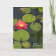 Röd dahlia flyter i vatten i dammen med grönt, lilja dynor för sympati. Text kan ändras.