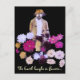 Det här vita, konstnärliga vykortet har en mystisk borttappad av blomsterträdgårdsodlare i sina dahlier. Han är klädd i gulbrun, guld, vit och brun och sportar en hatt för skade, skägg och mustasch. Blommorna är magenta, rosa, gult, lavendel och lila och bildar en abstrakt mönster som snurrar runt honom. Underbart för Jorden eller när du vill tänka grönt. Texten, som är ett citat från Ralph Waldo Emerson, lyder: Jorden skrattar i blommor. Den kan anpassas eller tas bort.