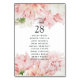 Orderkort för rosa och vit bröllop. Det finns dahlias, chrysanthemum och ro.
