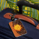 Namn bricka med ett foto i varma toner med kaffebönor och en gult daisy som är tonad med orange på träbakgrund.