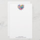 Stationery paper with a beautiful illustration. A heart-shaped bouquet of flowers in pastel blue, green, purple and yellow. With a lovely blue butterfly hovering in front.