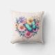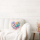 Pillow with a beautiful illustration. A heart-shaped bouquet of flowers in pastel blue, green, purple and yellow. With a lovely blue butterfly hovering in front.