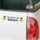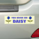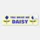 Den briljanta stötfångaren har två digitala bilder av en daisy med en grönt med två löv av grönt på den och lätta och mörk blått färgader med ljusblå mittpunkt. Bakgrunden är solljus gult och den ljusblå texten läser, du kör mig daisy.