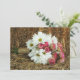 En bröllopsinbjudning med ett foto av en bukett med daisy och rosa blommor som vilar på en hö. Motsatt sida har hö-bakgrund. Anpassa texten med information om tillfälle.