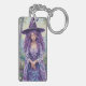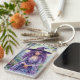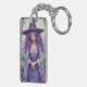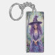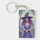 Denna fantasinyckelring har en lugn, lila-hårig häxa i en förtrollad skog, iförd en bredbrättad hatt och flytande klänning bland tusenskönor - drömlik, mystisk fantasikonst illustration. Färdig i en oljeakryl impasto målerisk stil.