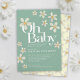 Cute oh baby blommor babyduschar inbjudan, med lös handmålad blomma av daisy och gult på gröntens bakgrund. Anpassa med din egen babyduschinformation. © Uniquated daisy blommor in gouache and designad by Sarah Trett exklusivt för www.mylittleeden.com