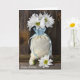Daisy bouquet i väska med blått satin på rustiskt trä.