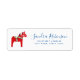 Returadressetikett med röd Dala-häst. Dala-hästar är traditionella trähästar, karvade och målade hästar från den svenska provinsen dalarna. Anpassade namn och adress. Det vore bra om ni kunde visa er svenska eller skandinaviska härkomst.