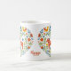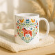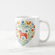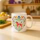 Embrace the Danish and Norwegian concept of Hygge—a feeling of cozy contentment and well-being—with this charming coffee mug. The design features a heart shape filled with traditional Scandinavian folk art motifs, including a Dala horse, stylized birds, and vibrant florals. This mug makes a beautiful, thoughtful gift idea for anyone who loves Nordic decor, traditional designs, and cozy home aesthetics. It's the perfect vessel for your slow morning tea or coffee.